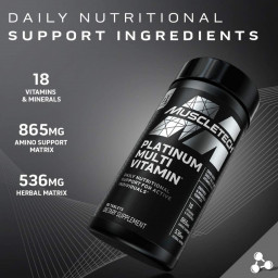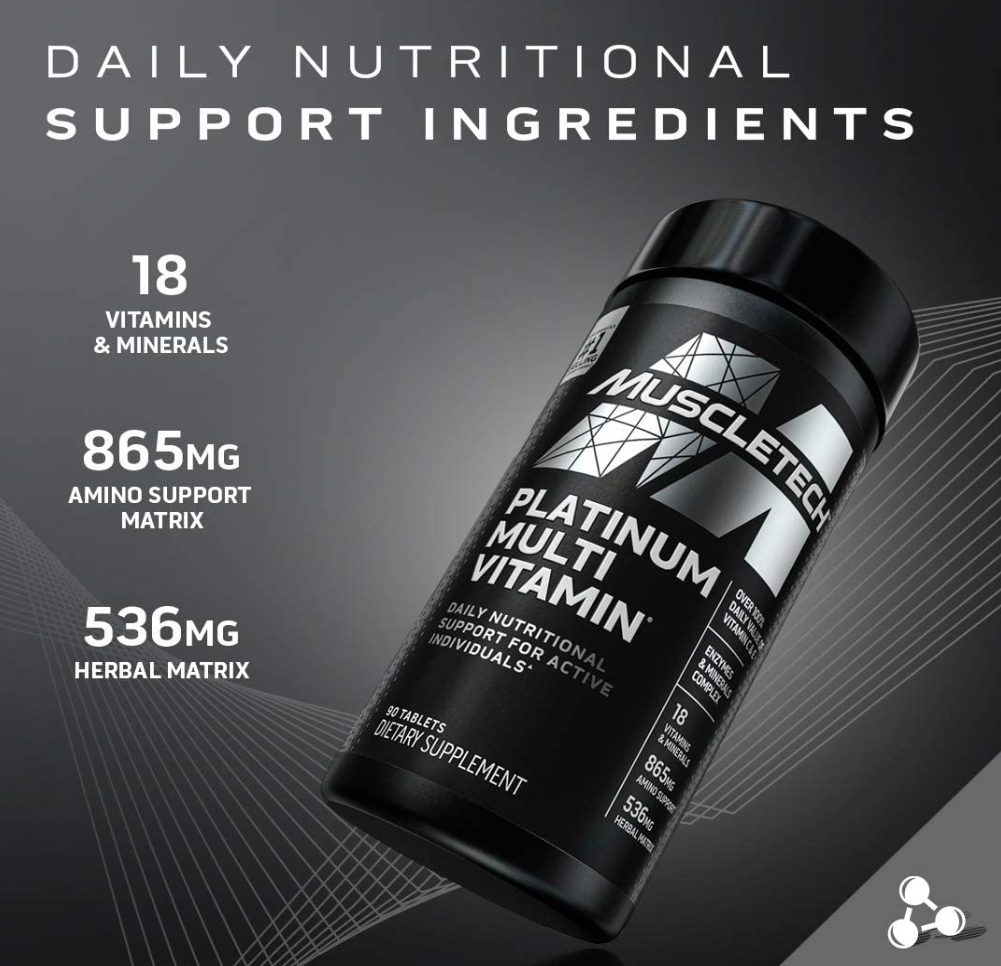 - Platinum Multivitamin de Muscletech es un multivitamínico y mineral que proporciona micronutrientes básicos para el mantenimiento de la salud y del rendimiento deportivo intenso.