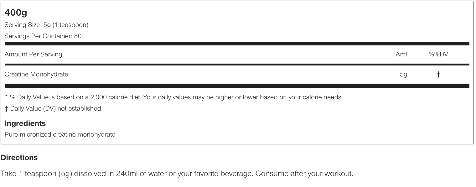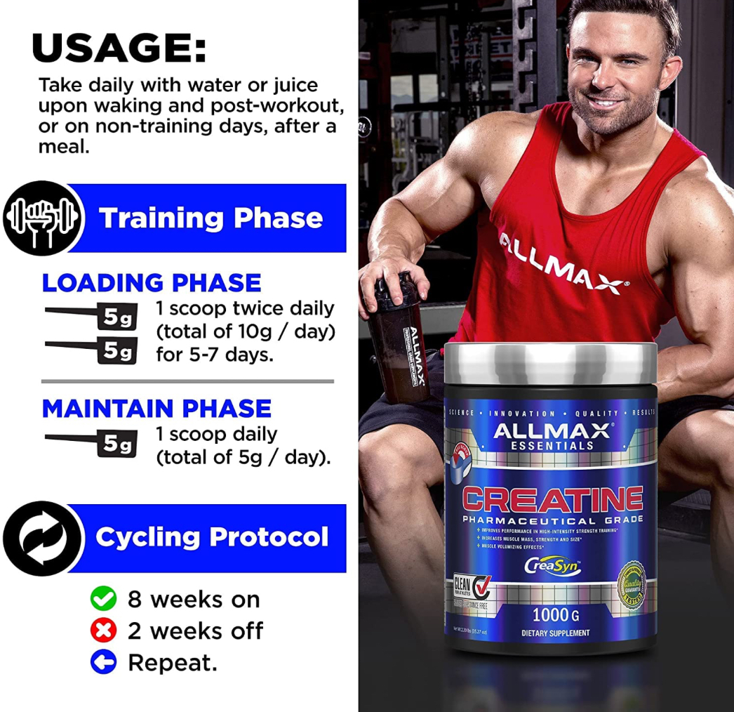 - - Aumenta la energía: la creatina es un compuesto natural en el cuerpo que ayuda a suministrar energía a todas las células, principalmente células musculares. La creatina es una fuente de energía rápidamente disponible para las contracciones musculares utilizadas para mejorar el rendimiento atlético. Se ha demostrado que la creatina aumenta la fuerza y resistencia máximas hasta un 15% y hasta un 30% en potencia de salida y liberación de energía en deportes de corto ráfaga/intervalo.